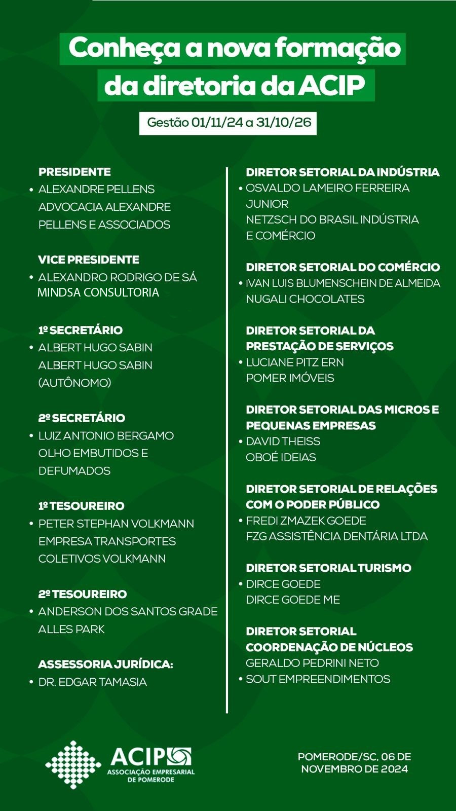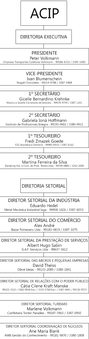 O primeiro Presidente da ACIP foi o empresário CID ERWIN LANG, sucedido por Augusto Guilherme Schwanke (in memorian), Mariogold Liekfeld, Reinaldo Riffel Júnior, Anete Konell, Udo Boss, Armin Harbs, Ideraldo Findeiss, Gerhard Kurt Weiser, Fredi Zmazek Goede, Ivan Blumenschein, Peter S. Volkmann, FREDI ZMAZEK GOEDE, sendo o atual Presidente ALEXANDRE PELLENS, com o mandato até 31 de outubro de 2025.
